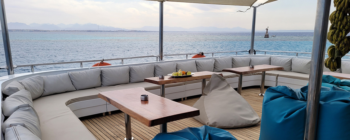 The spacious restaurant is located on the main deck. The chef and his team prepare every day fresh Egyptian and international dishes to please even the most discerning palates. On the upper deck there is a salon with comfortable seating and a large plasma TV. In front of the salon, a large sun terrace with bar invites you to relax.