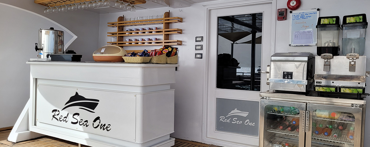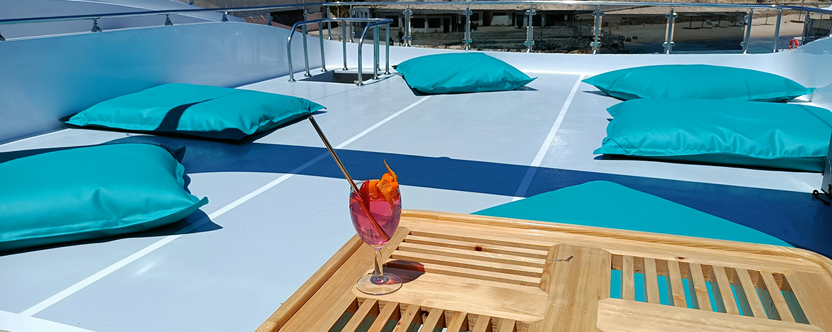 Beverages and snacks are available around the clock. After the last dive of the day, you can enjoy a deco beer, a glass of wine or even a cocktail accompanied by music. There is also plenty of space to sunbathe and relax in the front area of the upper deck. The high deck also offers additional space with sun loungers, hammocks and the opportunity for breathing or stretching sessions.