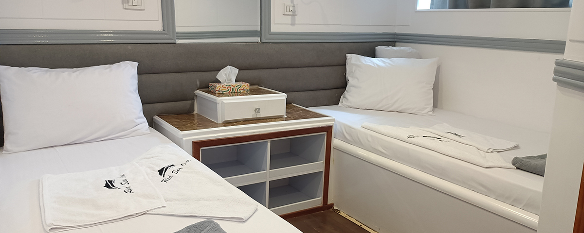 The 38m long modern safari yacht Red Sea One offers both divers and non-divers plenty of space and room to relax and provides all the prerequisites for unforgettable holidays in a family atmosphere. Of the 14 cabins spread over three decks, a maximum of 13 are occupied by guests, so we have room for a maximum of 26 guests. However, some tours, such as our freediving safaris, are also offered for a maximum of 20 guests to ensure even more comfort.