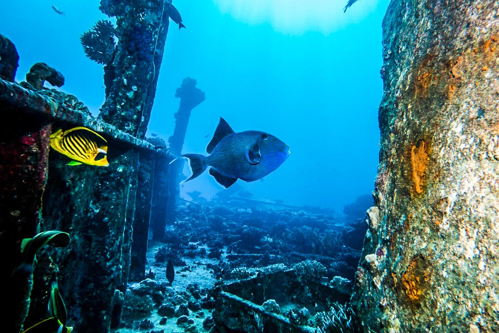 The Thistlegorm is probably the most famous wreck in the Red Sea. The English war freighter was on her way to Egypt to supply the English Africa Corps stationed there with supplies when she was attacked by a German bomber on 6.10.1941 and sank. The wreck lies upright on the seabed at a depth of 30 meters. The cargo is particularly interesting: tanks, trucks, weapons, motorcycles, railroad cars as well as a locomotive. Dives at the Thistlegorm are definitely among the highlights in every diver’s logbook!