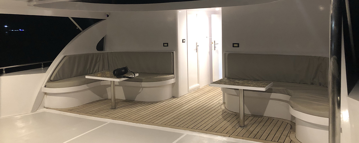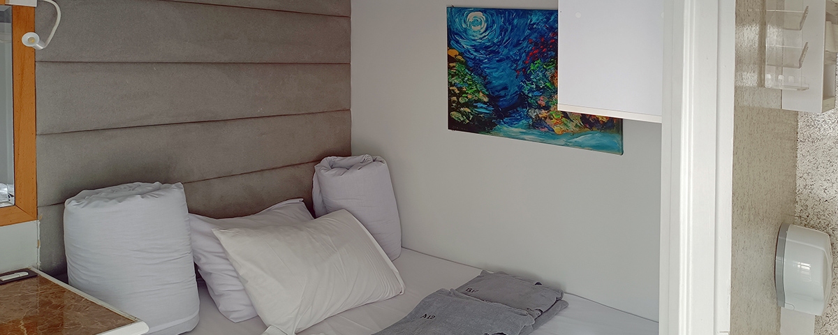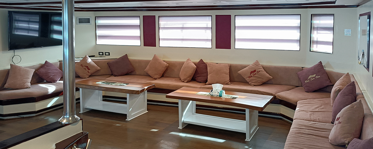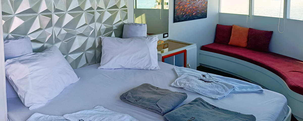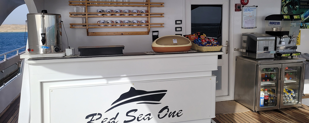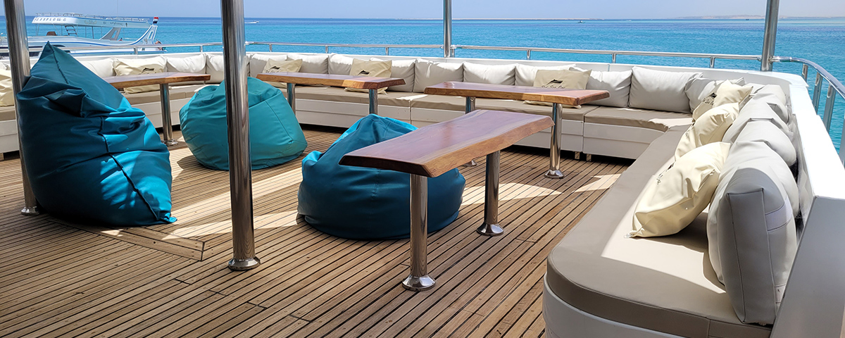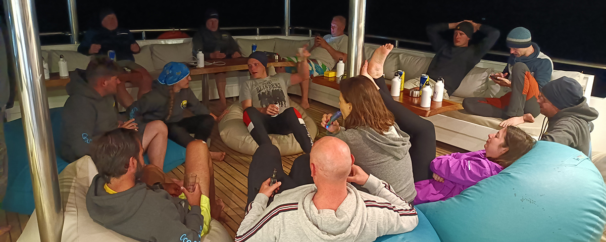Beverages and snacks are available around the clock. After the last dive of the day, you can enjoy a deco beer, a glass of wine or even a cocktail accompanied by music. There is also plenty of space to sunbathe and relax in the front area of the upper deck. The high deck also offers additional space with sun loungers, hammocks and the opportunity for breathing or stretching sessions.