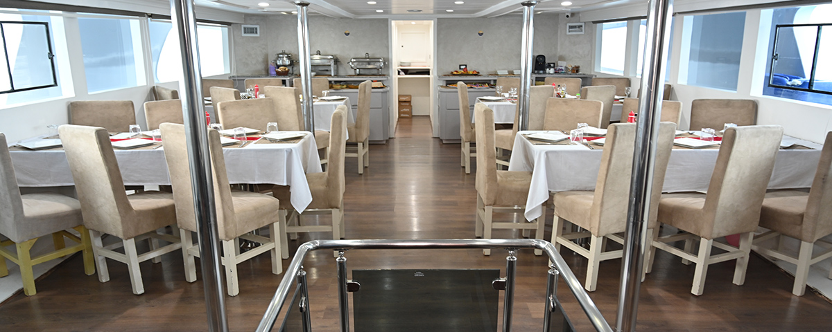 The spacious restaurant is located on the main deck. The chef and his team prepare every day fresh Egyptian and international dishes to please even the most discerning palates. On the upper deck there is a salon with comfortable seating and a large plasma TV. In front of the salon, a large sun terrace with bar invites you to relax.